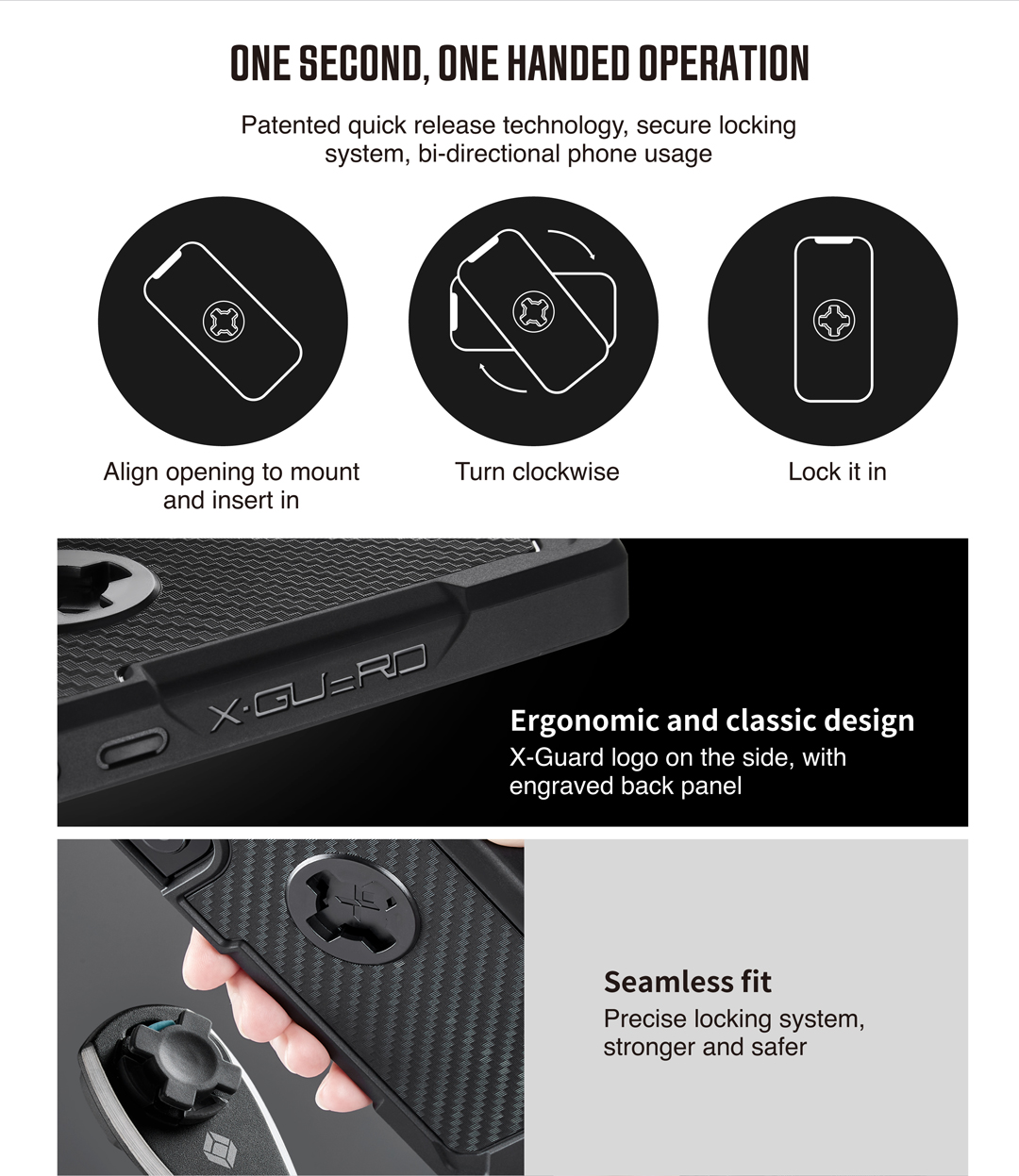 ► Quick release technology: secure locking system, bi-directional phone usage